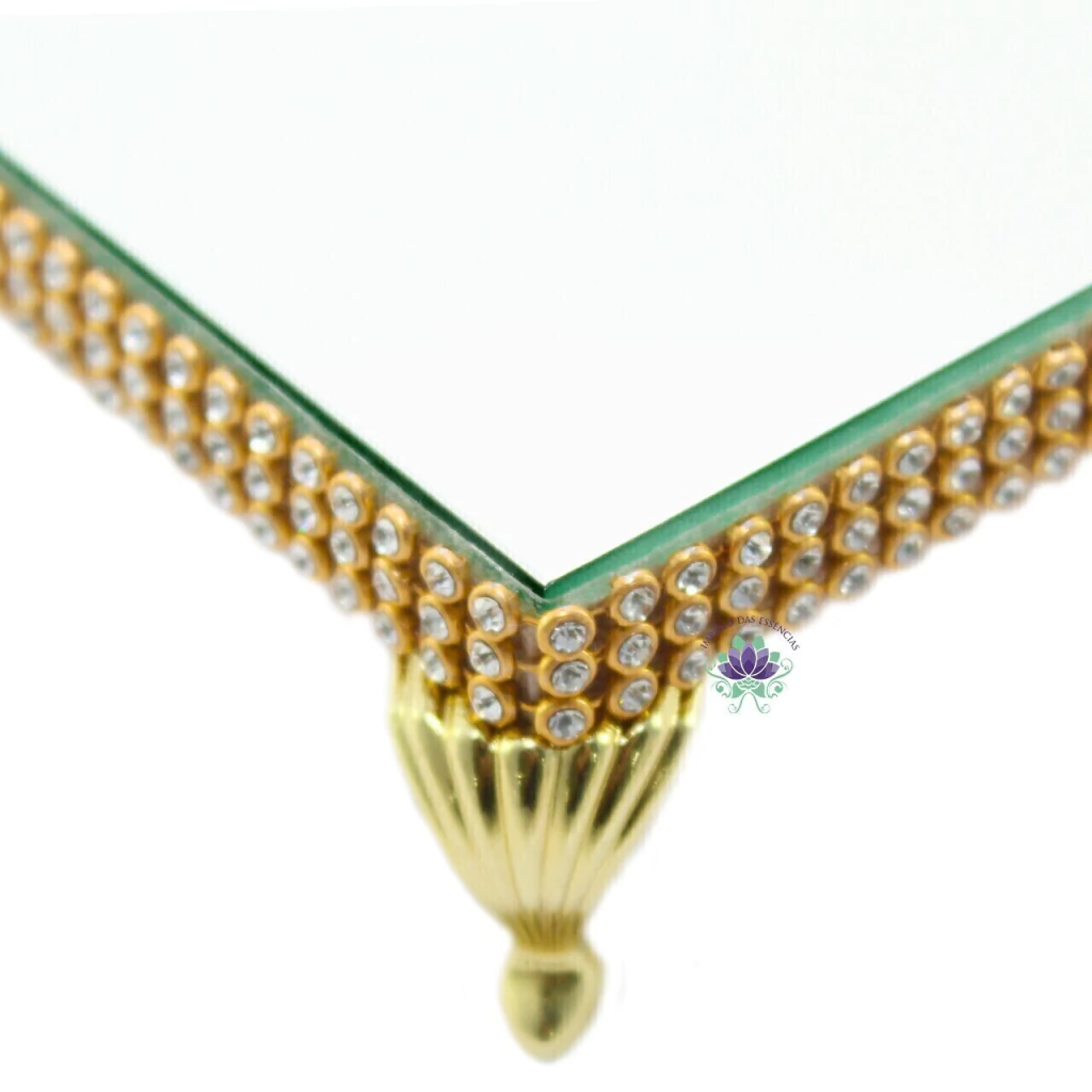 A bandeja retangular com sua base de vidro espelhado estrass dourado em todo ao seu redor e seus pés dourado dão um ar de sofisticação na peça, combina com todos os tipos de ambientes, deixando a decoração local com um toque elegante.