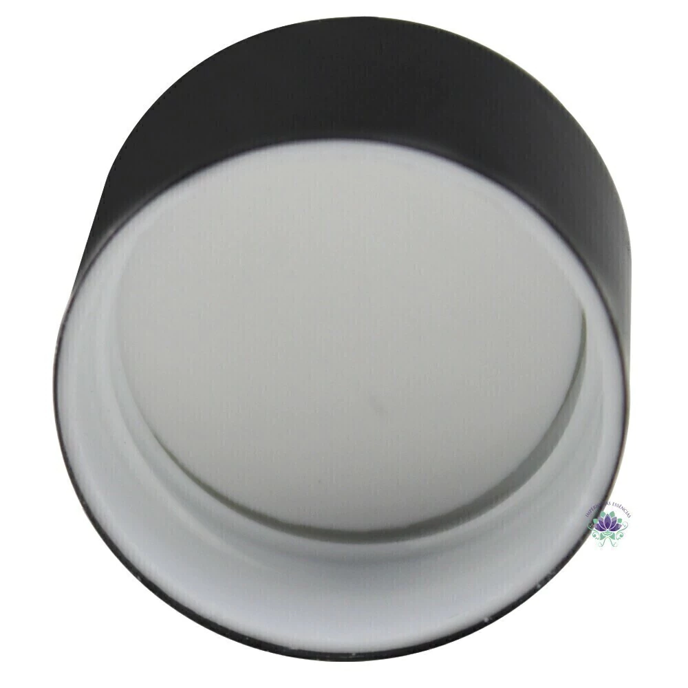 Tampa lisa e revestida de material cromado brilhoso na cor preta., seu acabamento interno é feito com disco de polexam (polietileno expandido), é uma vedação evita vazamentos, evaporação e ressecamento do produto, também garante um ajuste e fechamento hermético entre tampa e frasco.